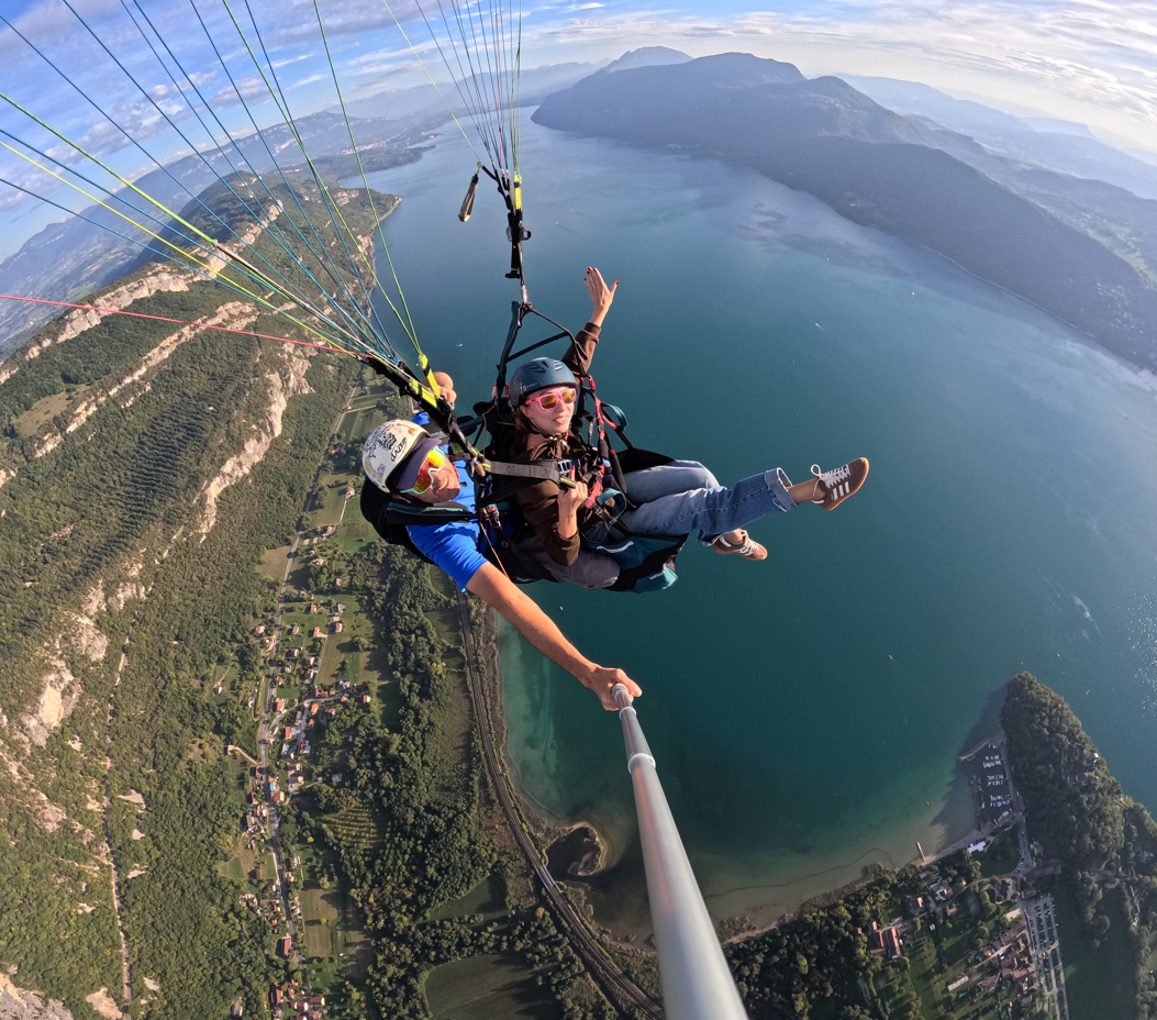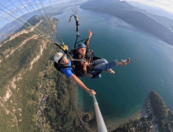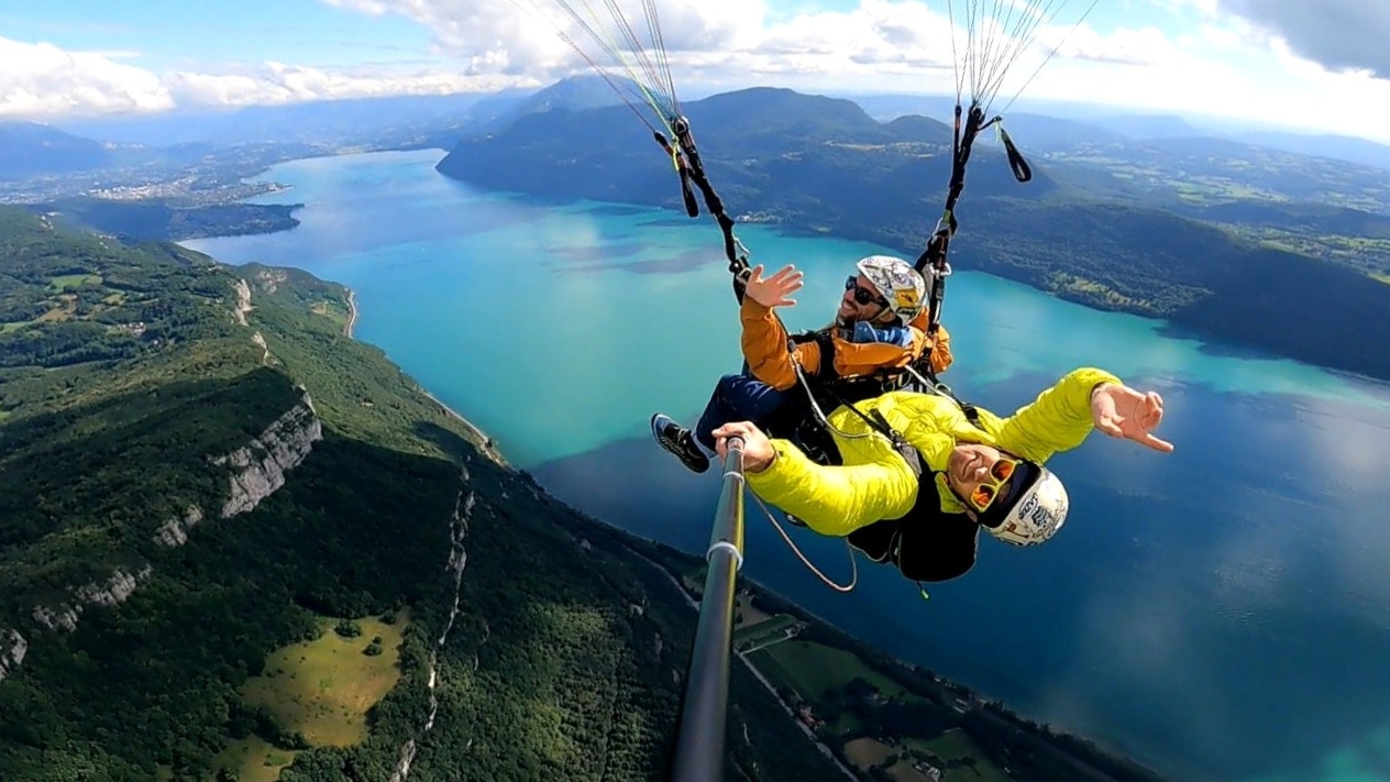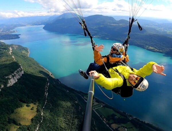 Avec Plein Ciel Parapente, vous décollez en tandem avec un moniteur professionnel pour un vol en toute sécurité au-dessus du lac et des montagnes environnantes.